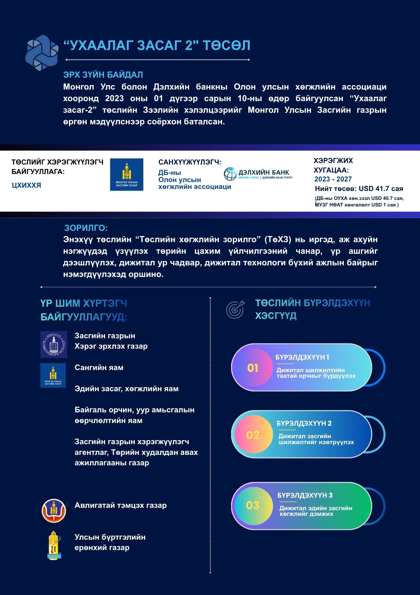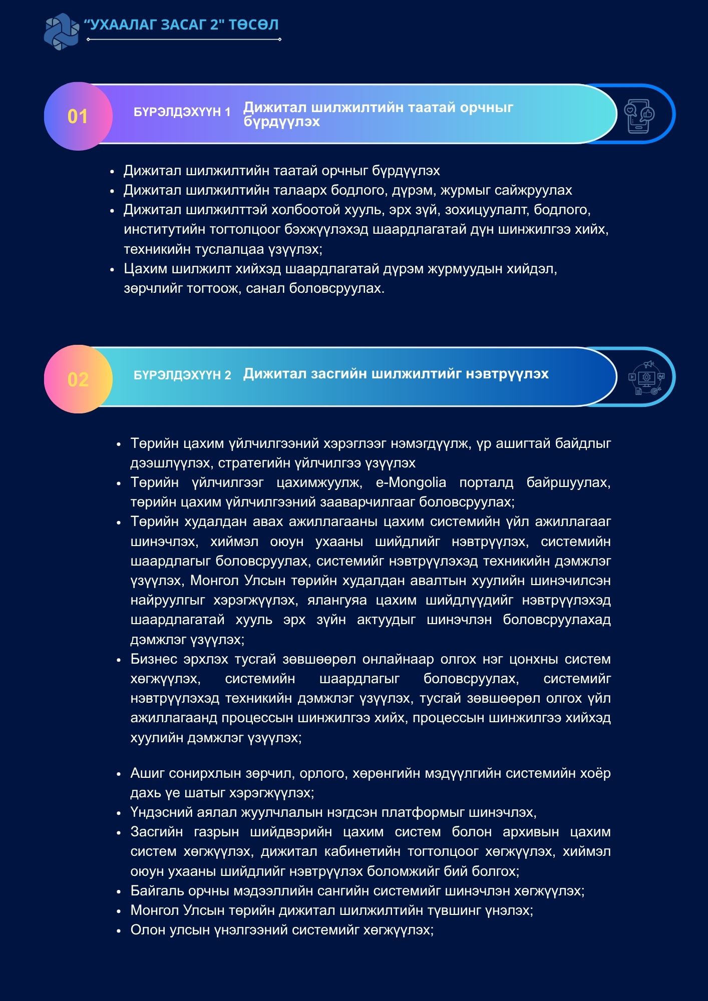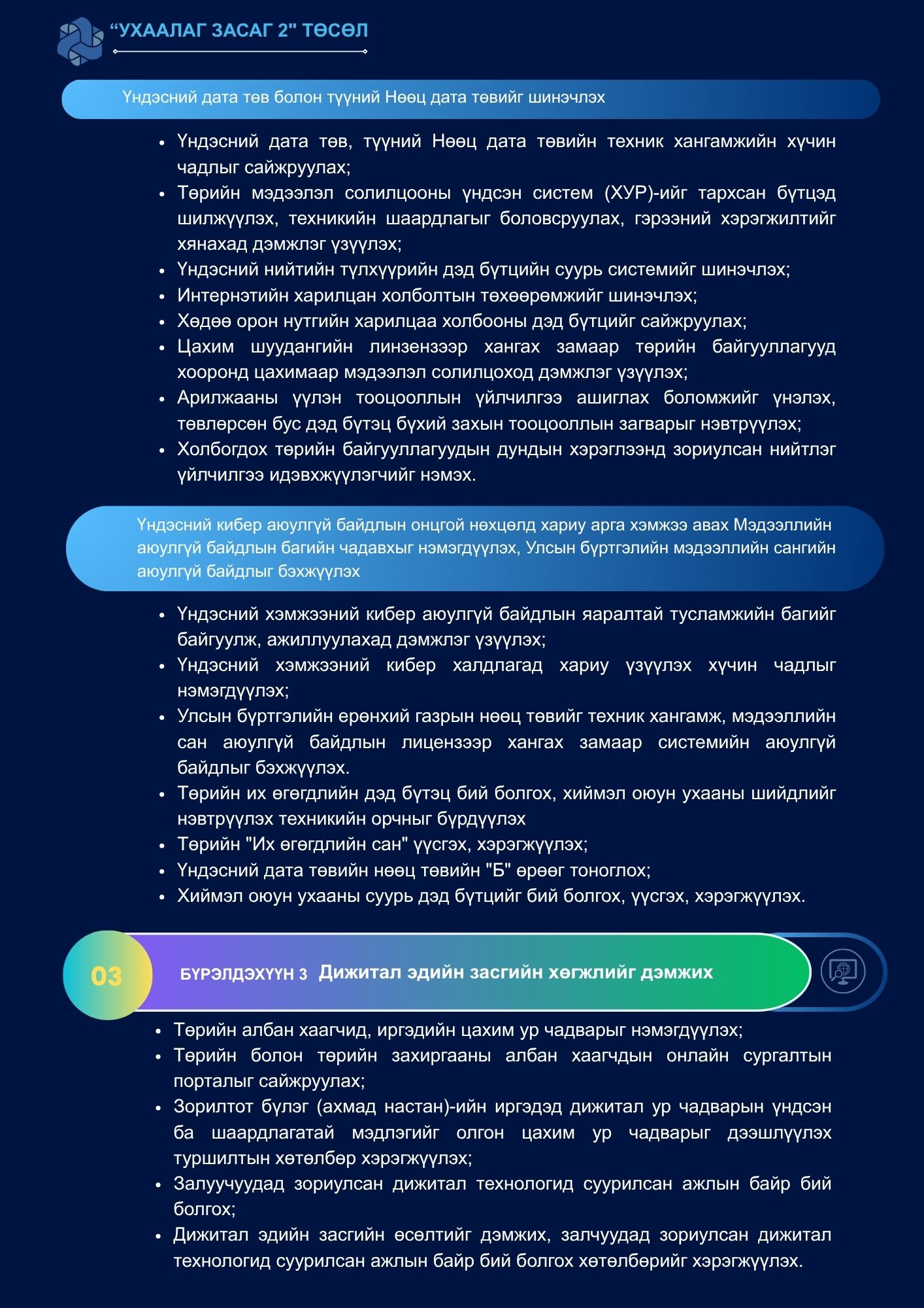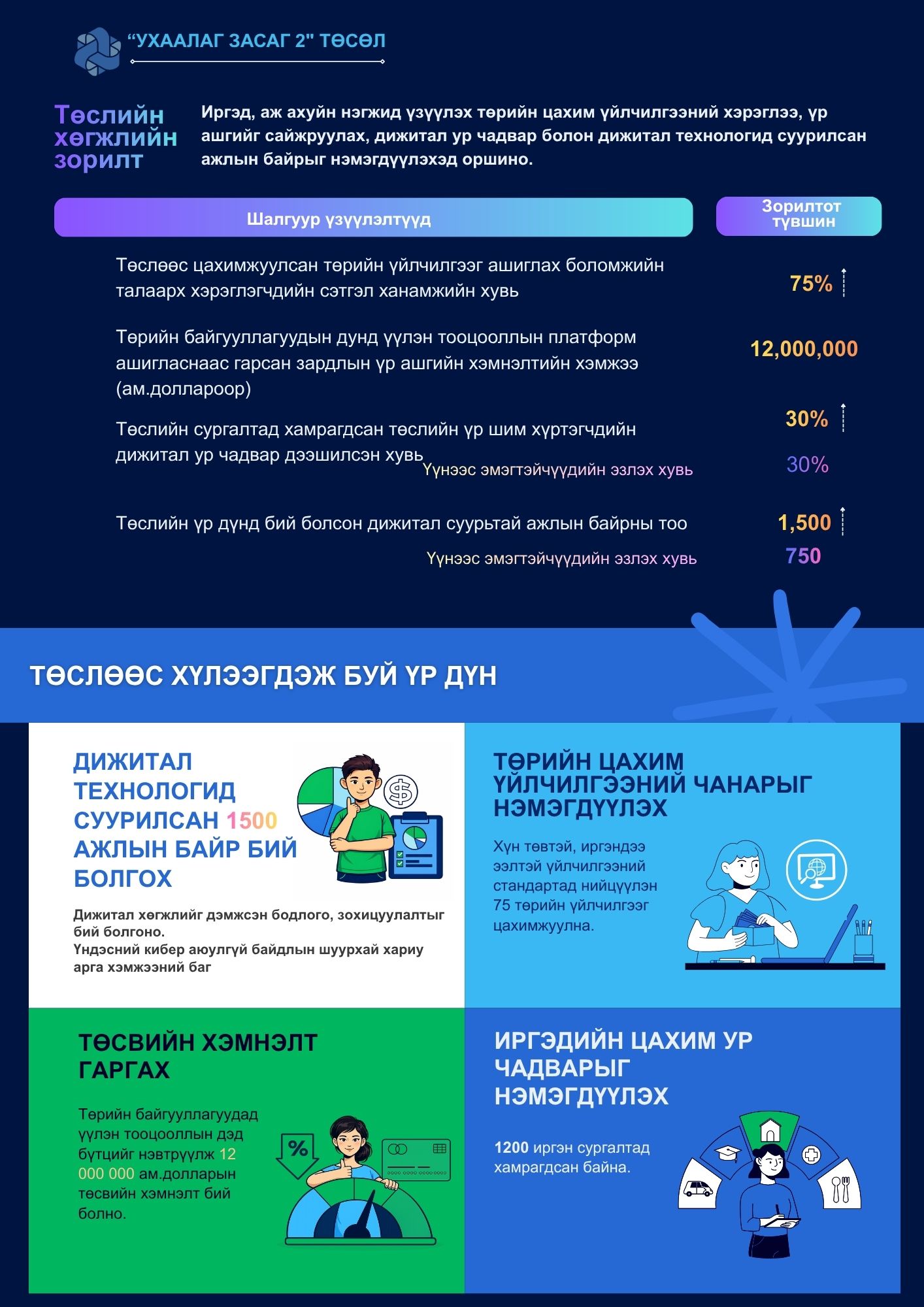 Иргэд, аж ахуйн нэгжүүдэд үзүүлэх төрийн цахим үйлчилгээний үр ашгийг дээшлүүлэх, иргэдийн дижитал ур чадвар, дижитал технологи бүхий ажлын байрыг нэмэгдүүлэх зорилготой.
